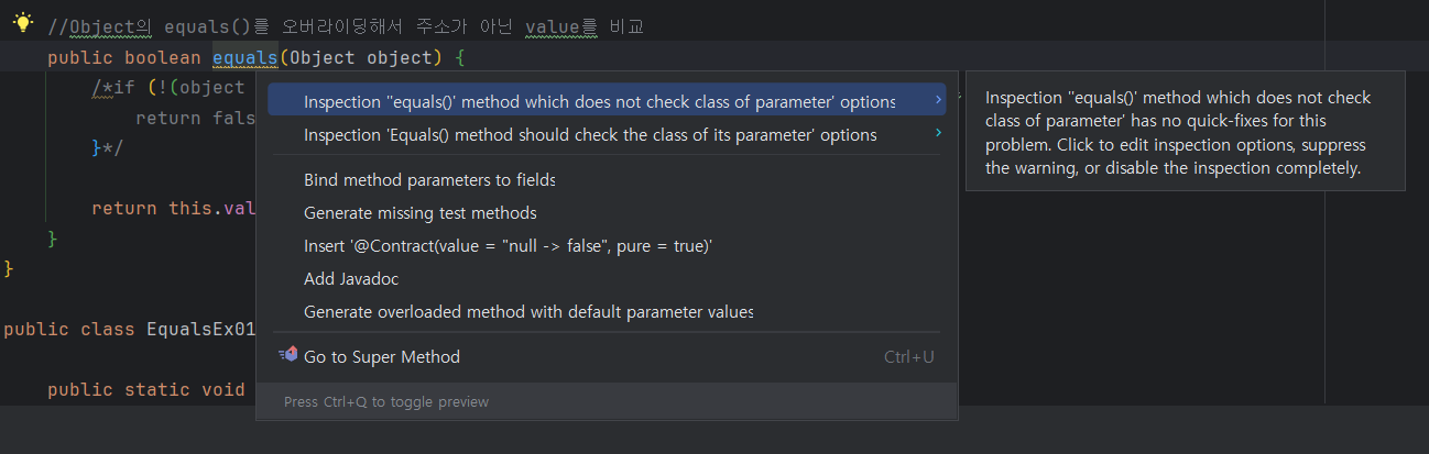 - equals()와 hashCode()의 규약을 따르지 않으면, **해시 기반 컬렉션(HashMap, HashSet 등)**에서 예상치 못한 동작이 발생할 수 있다.