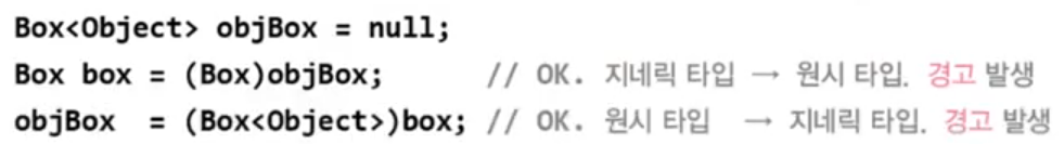 - 제네릭 타입과 원시 타입 간의 형변환은 바람직 하지 않다.(경고 발생)