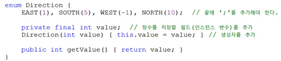 Direction d = new Direction(1); // 에러, 열거형의 생성자는 외부에서 호출 불가