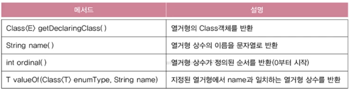 - 모든 열거형은 Enum의 자손이며, 아래의 메서드를 상속받는다.